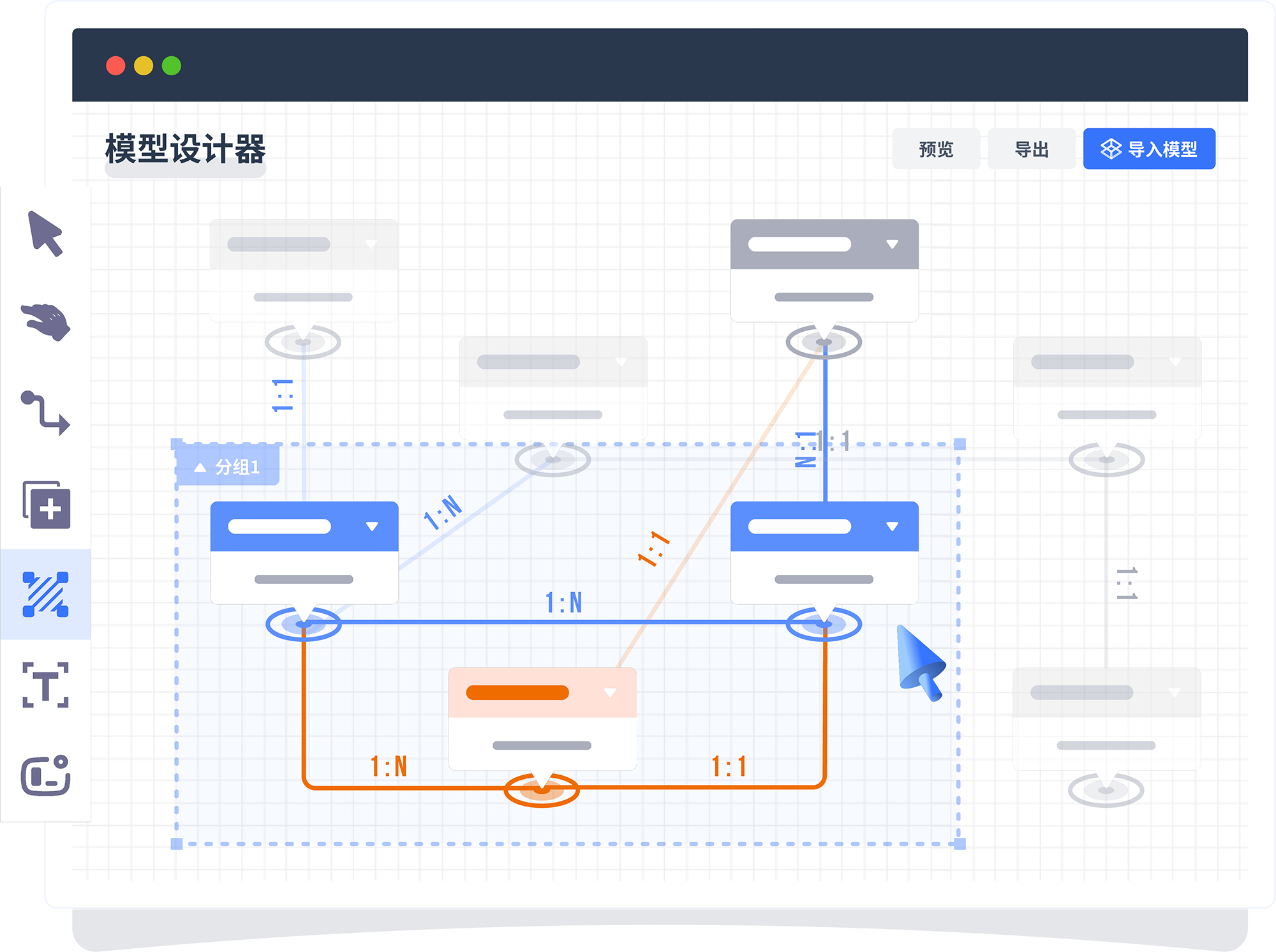 基于用户故事设计业务模型,,,采用图形化方式完成er图设计,,,支持多层分组,,,面向复杂模型也可以条理清晰,,,模型支持预览、、、导入、、、导出。。。