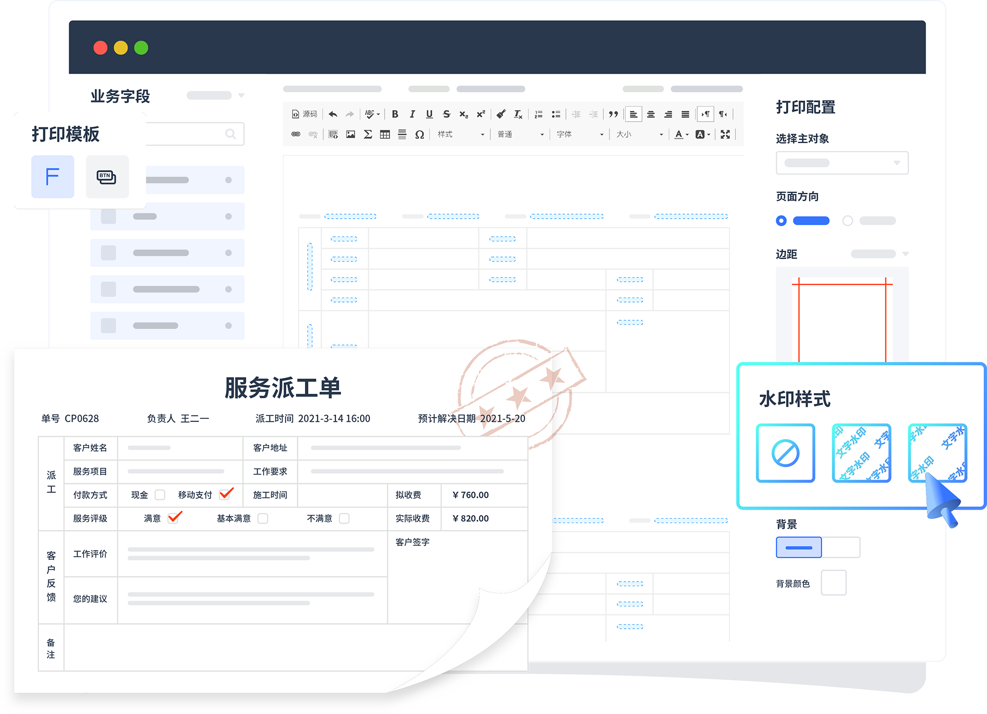 业务场景所需的打印/输出文档也支持自定义,,,关联系统内数据支持水印等辅助配置。。。
